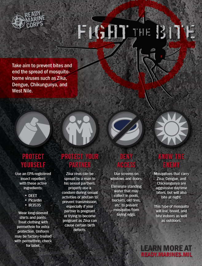 Sun’s out―bugs out. That is the reality facing many Marine Corps Installations this summer as the mosquito that carries the Zika virus becomes more active. To combat this potential threat, Ready Marine Corps―the Marine Corps’ public awareness and emergency readiness program―is launching the “Fight the Bite” campaign to educate the community about mosquito-borne illness and how to mitigate the risk of transmission.